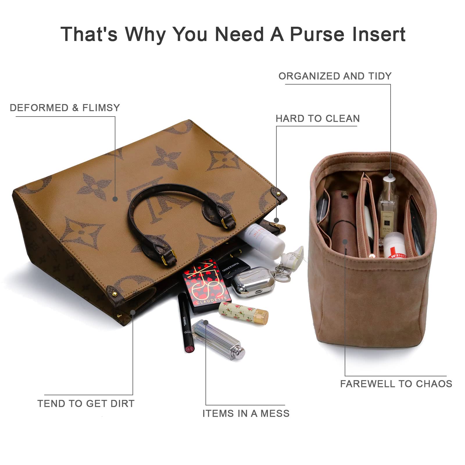 For Neverfull MM/Garden Party 36/Birkin 40 and More | Suede Velvet Handbag Organizer Insert