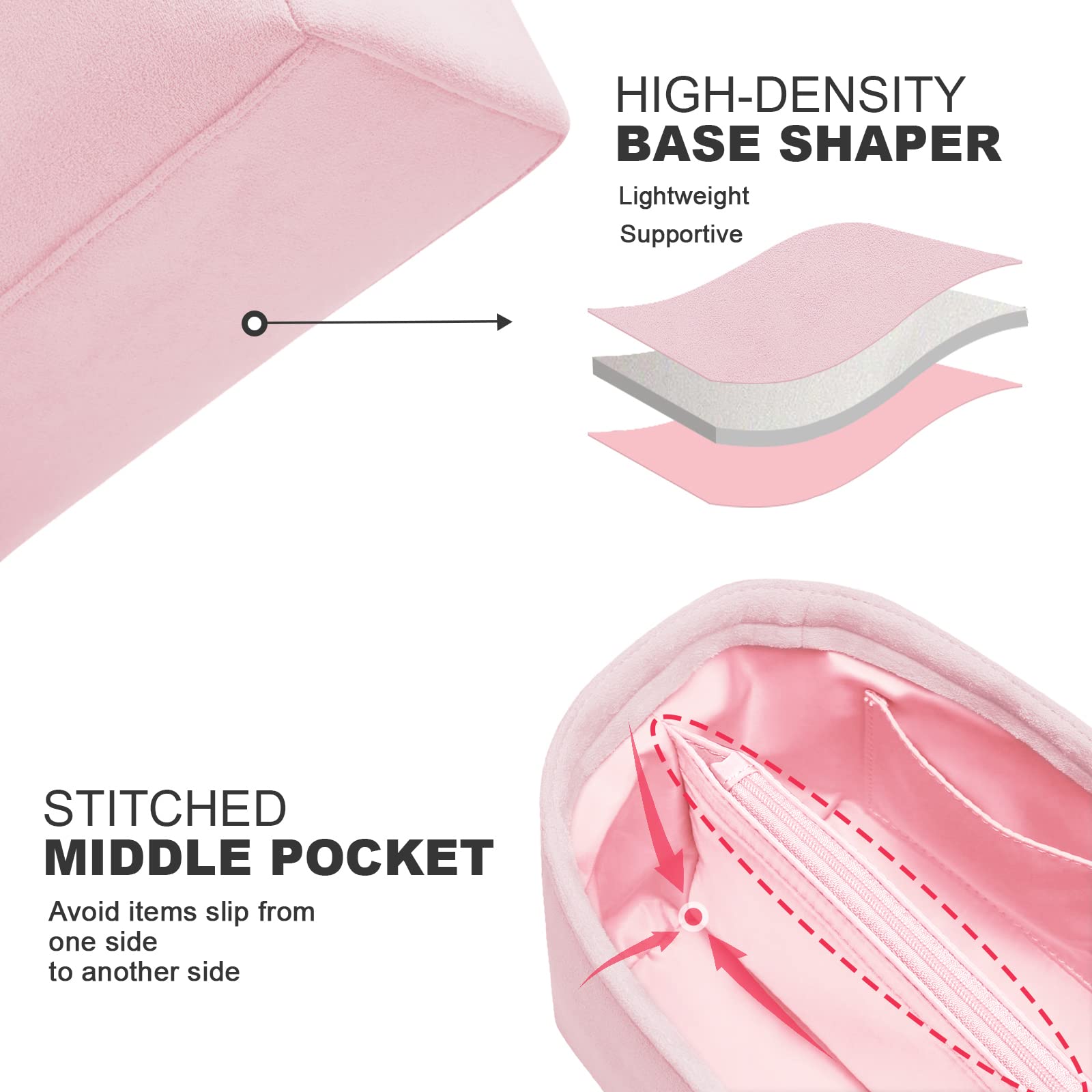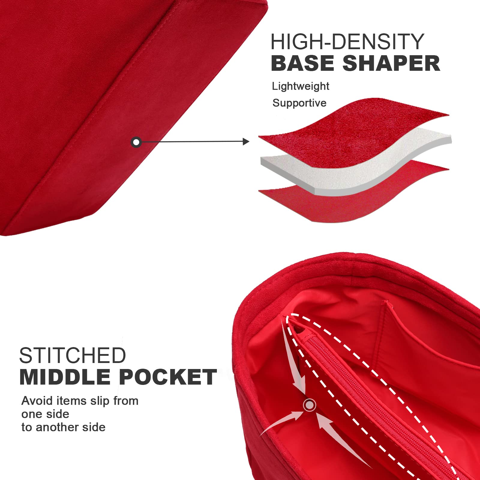 The middle layer is built-in 3mm EVA foam, which allows our insert to stand on itself and support your bag in a flexible shape.
